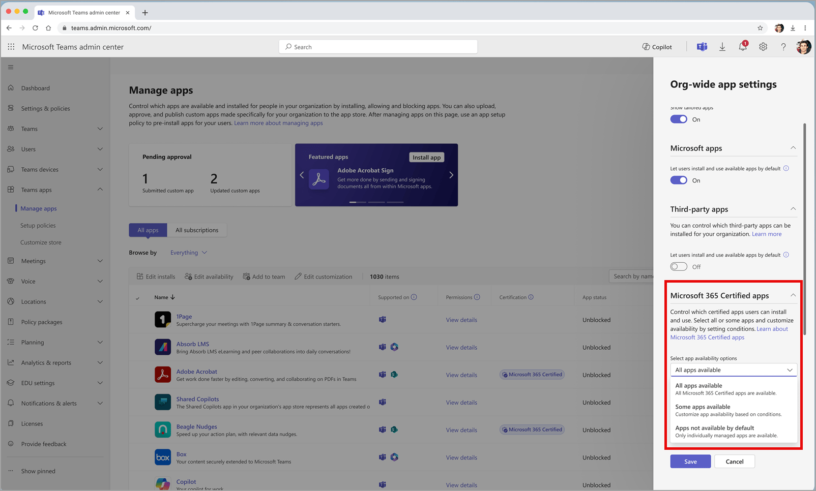 - Du findest die neue Option unter: Manage apps > Actions > Org-wide app settings > Microsoft 365 certified apps.